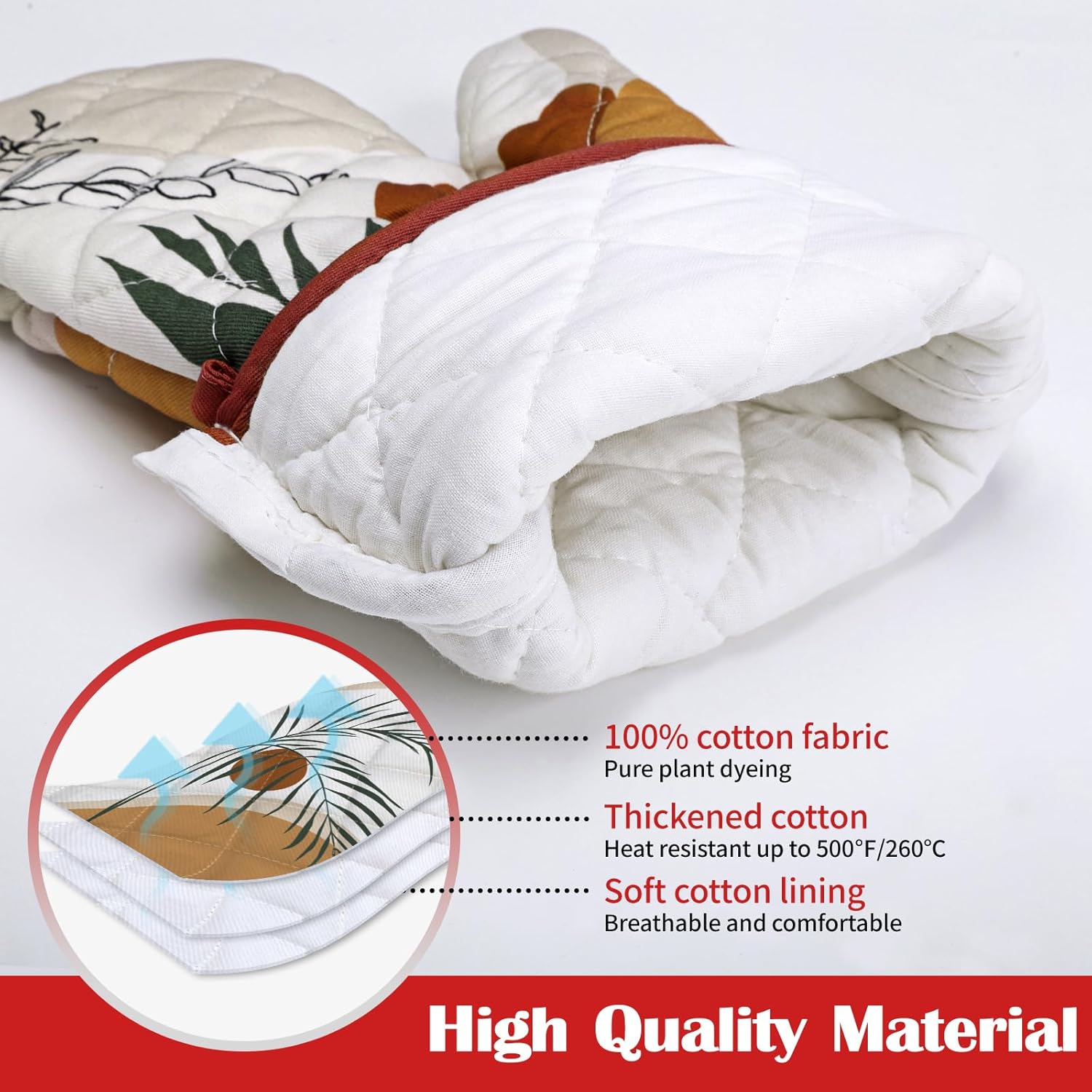 Boho Leaf Oven Mitts and Pot Holders Sets 4Pcs, 100% Cotton Heat Resistant, Extra Long Oven Gloves Potholder for Kitchen Cooking Baking Decoration