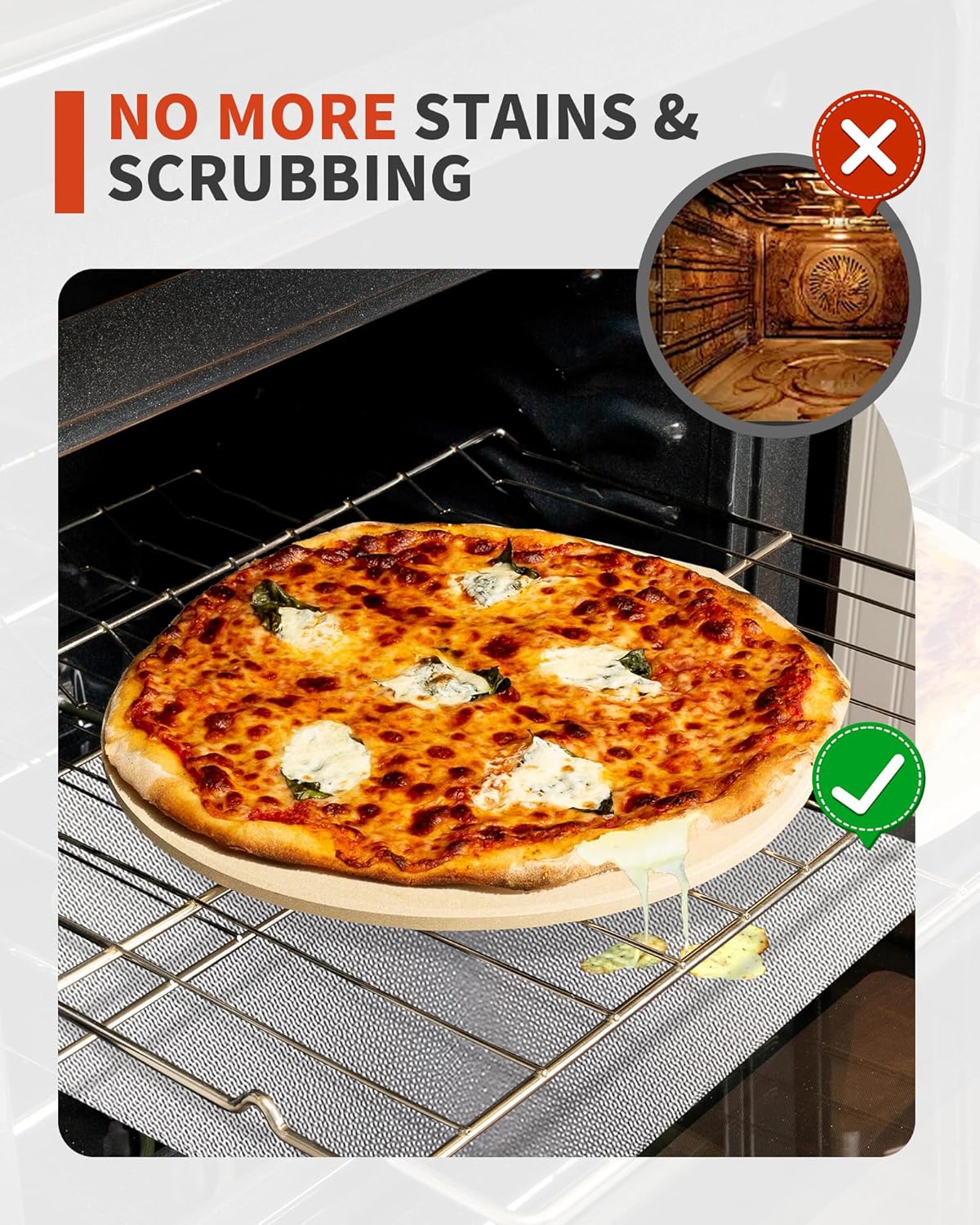 - Installation Flexibility: Works with both hidden and exposed heating elements; place on the lowest rack for hidden elements or directly under the element for exposed ones, avoiding direct contact