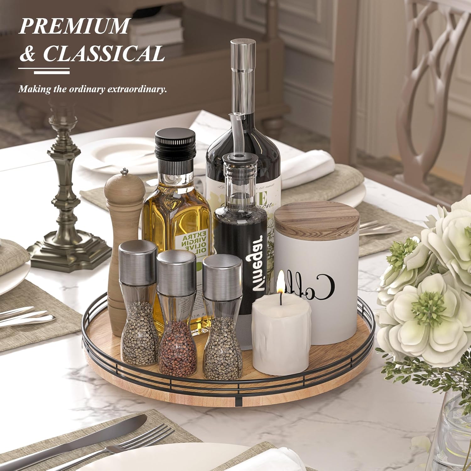 - PREMIUM MATERIAL: Our farmhouse lazy Susan organizer is made of natural solid oak wood and strong metal, sturdy, durable and premium quality. This wooden turntable organizer is a game-changer for keeping your kitchen organized. The farmhouse oak finish gives it a rustic, charming look that will fit perfectly with your kitchen decor.