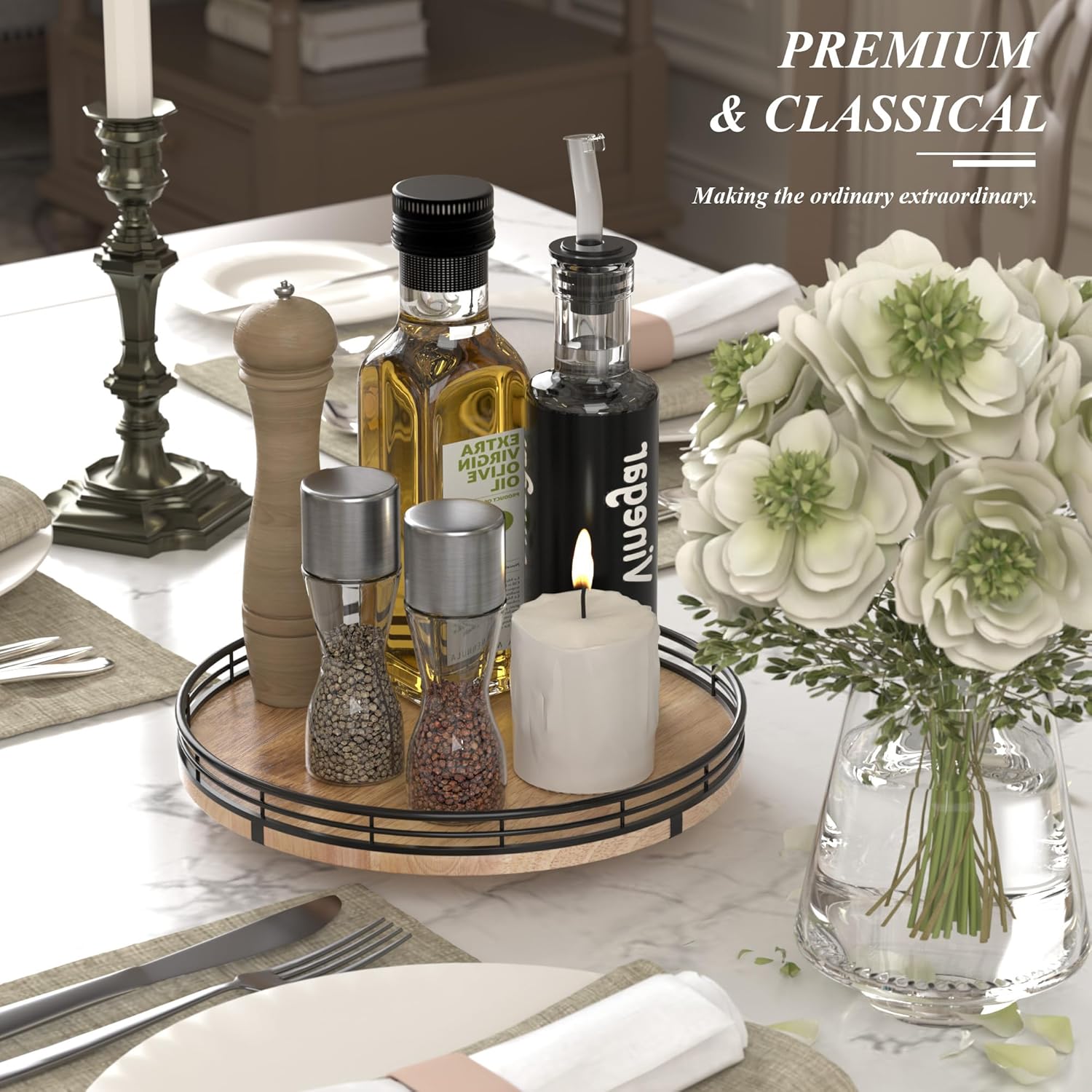 - UPDATED DESIGN: With larger wood base on this lazy Susan for table top, the turntable organizer doesn't wobble, even with heavier items on it. With premium oak wood and classical iron fence make this lazy Susan turntable stylish, functional and adding a touch of rustic charm. itβs also very easy to clean. There are included anti-slip pads on the bottom of the lazy Susan for extra surface protection.