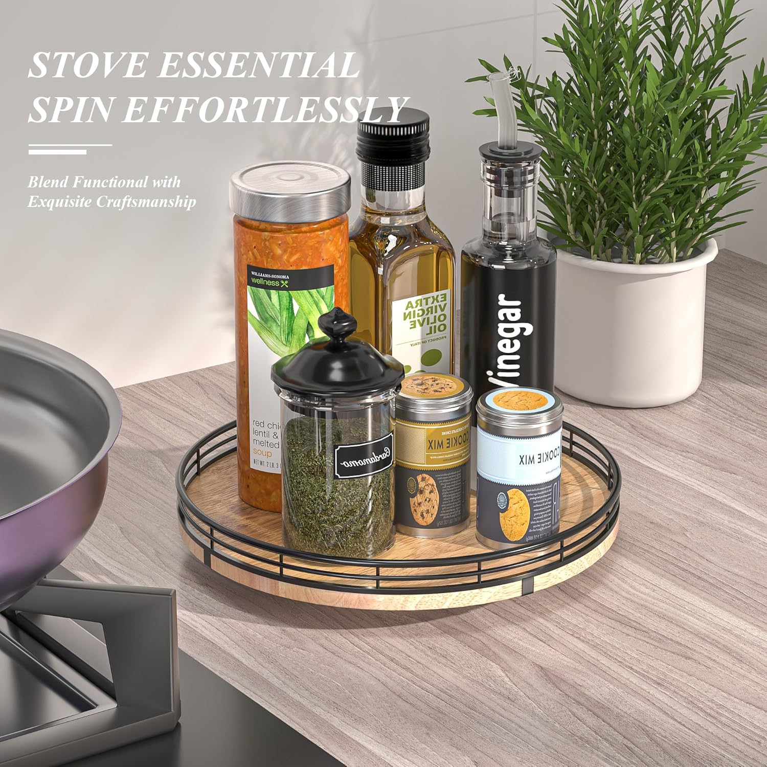 - 360 RATATING & MAXIMIZE SPACE: The base is made of solid wood and the spinning mechanism is made of steel ball bearings, which are well-built and allow for 360Β° smoothly spin. Making it super easy to access items at the back of your cabinet without having to remove everything in front. You can use it to store spices, condiments, and even small jars, and it keeps everything neatly in place.