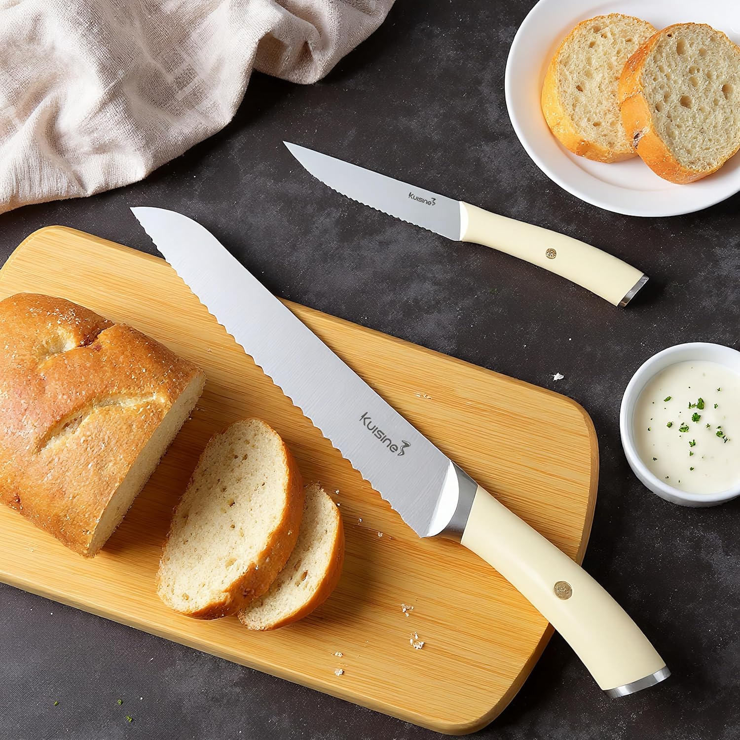 KUISINE Knife Set High Carbon Stainless Steel Super Sharp Blade Ergonomic Rivet Handle,Knife Block Set with Built-in Sharpener(Ivory Acacia Pro 15PCS)