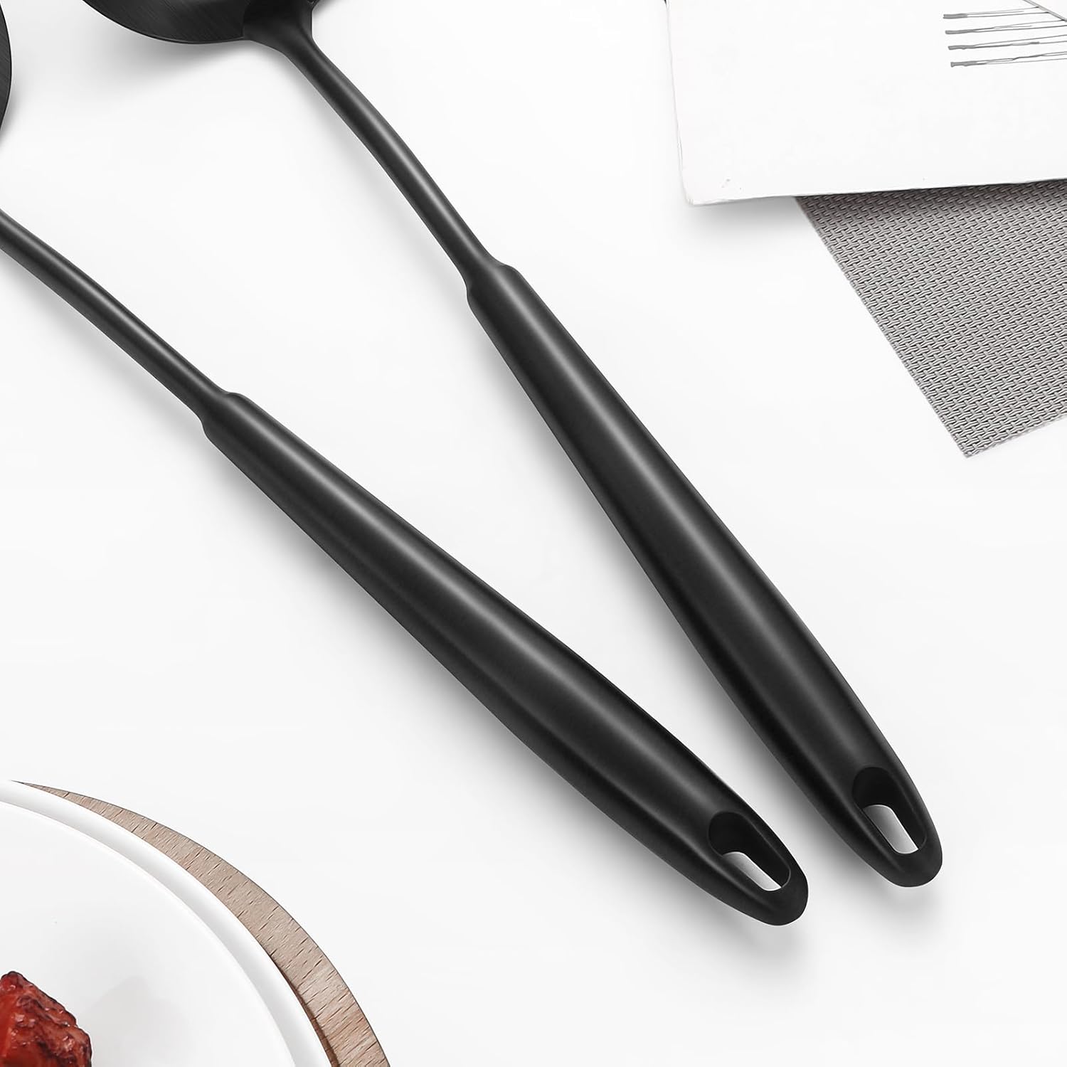304 Stainless Steel Cooking Utensils,6 Pcs Kitchen Cooking Utensils Set with Spatula, Solid Spoon, Ladle, Skimmer, Spaghetti Spoon,Dishwasher Safe(Black)