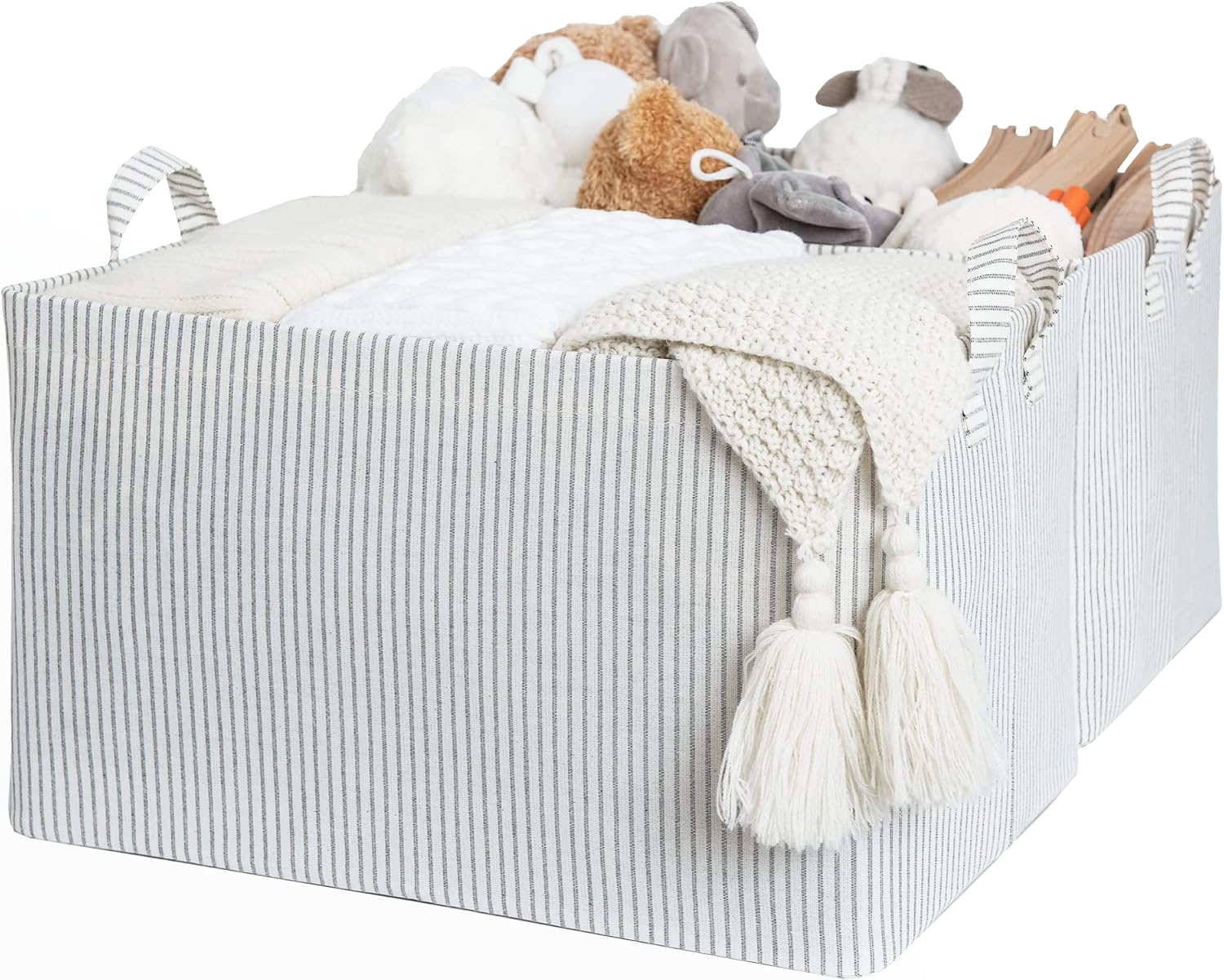 StorageWorks 45L Large Storage Bins for Closet and Shelves, Fabric Organizer Baskets with Metal Frame for Clothes, Towels, Collapsible Storage Basket, Gray and White Stripes, 2-Pack