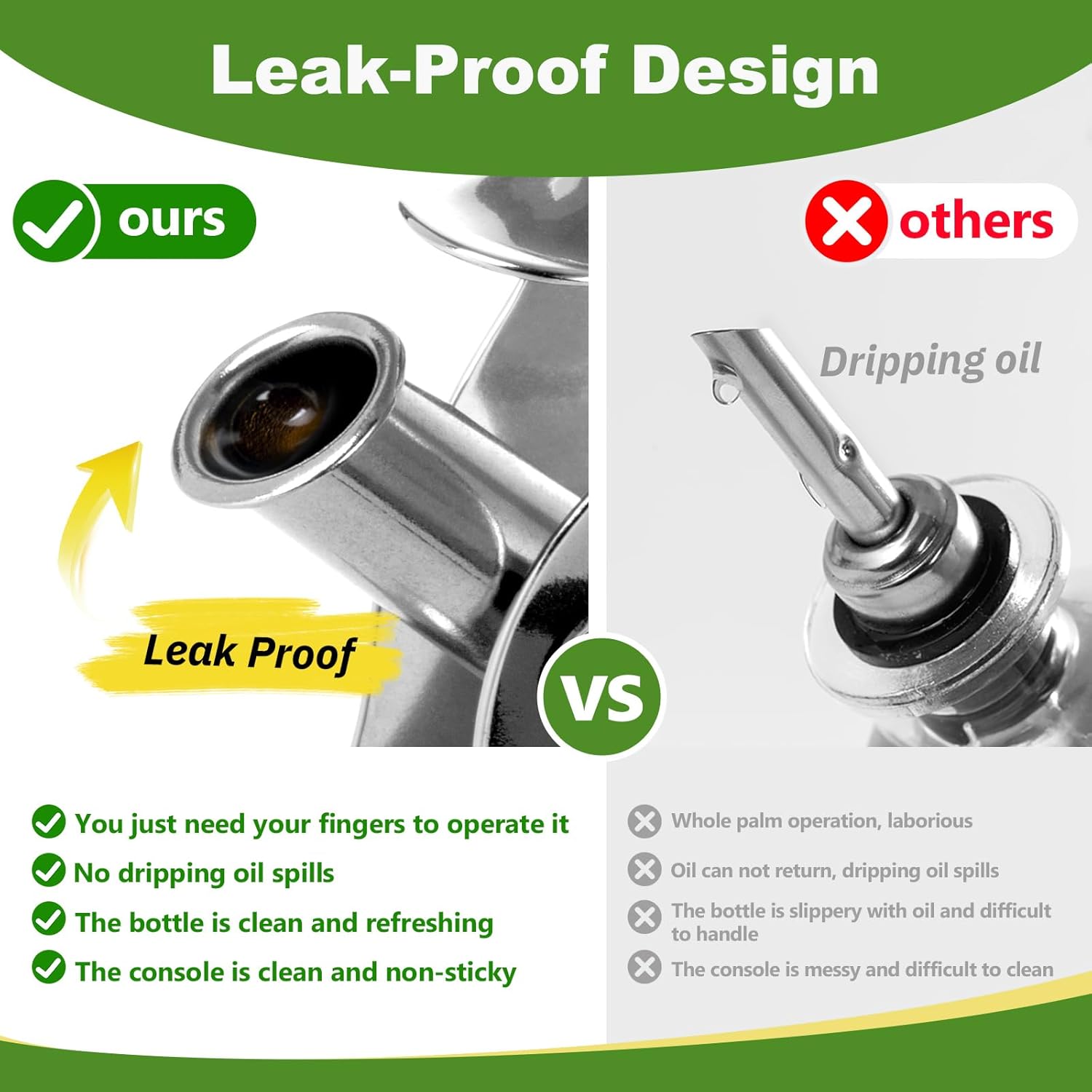 - Easy to Clean and Replace: Just soak or rinse the oil/wine dispensers in hot water if there are sticky liquids on the dispenser and they're ready to use again. Simple and easy to use and close