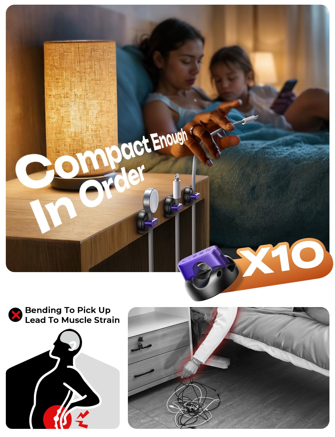10-Pack Magnetic Cable Clips [1S Snap-On] Cord Holder, LISEN Office Desk Organizers and Accessories with 5 Extra Strong Adhesive Pads, Wire Organizer for Nightstand, Home, Wall, Car, Desktop, Purple