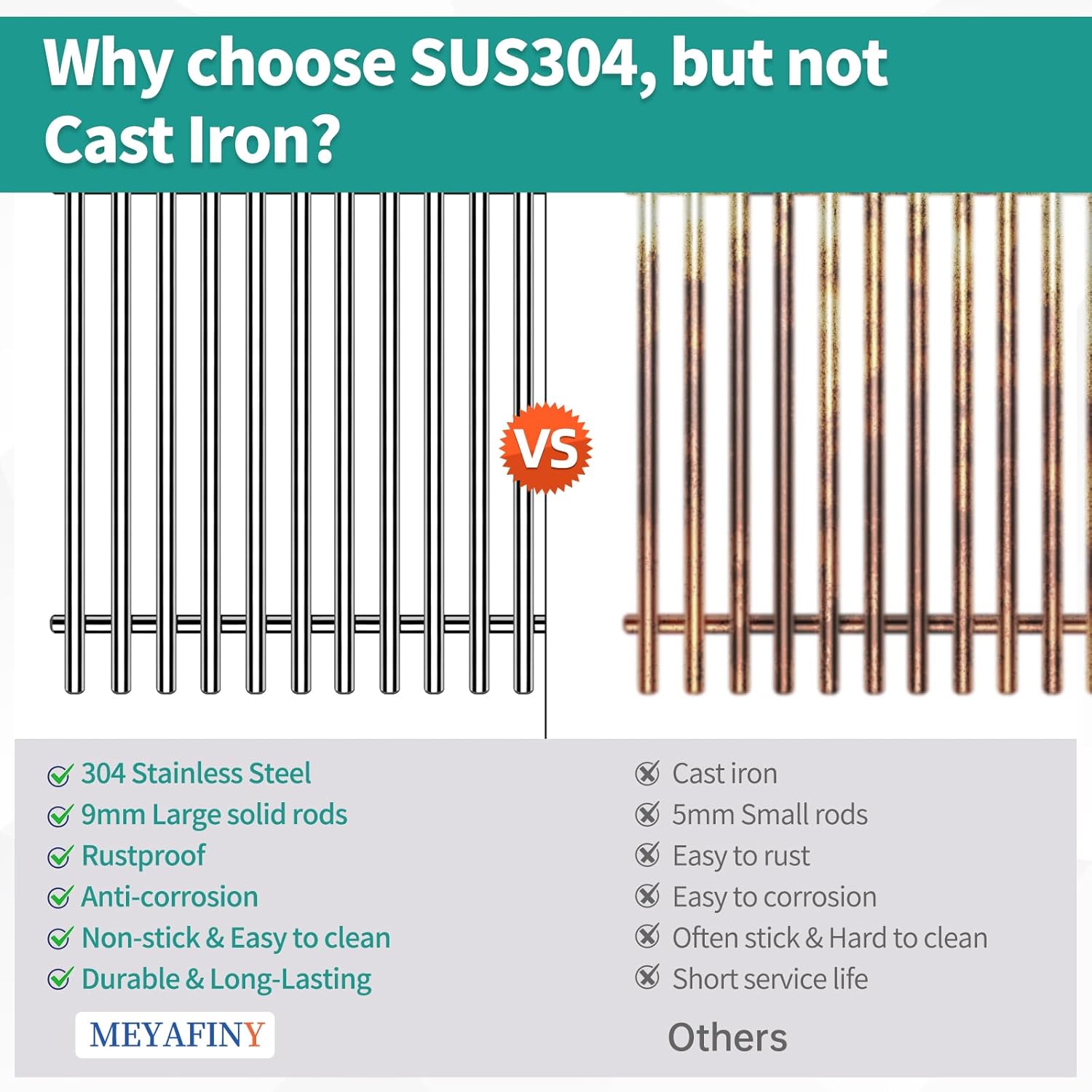 - 【Safe Material & Protect Your Hands】Meyafiny grill replacement parts are made of high-quality 100% food grade 304 heavy stainless steel and well-engineered to prevent rust, which is durable with uniform heating and high corrosion resistance, much more heavier and heavy duty. Our spirit grill grate with edge grinding design is free of sharp edges, made with nice welds and smooth surface, no sharp edges and will not hurt your hands. Best choice for your Weber Spirit 200 series gas grills.