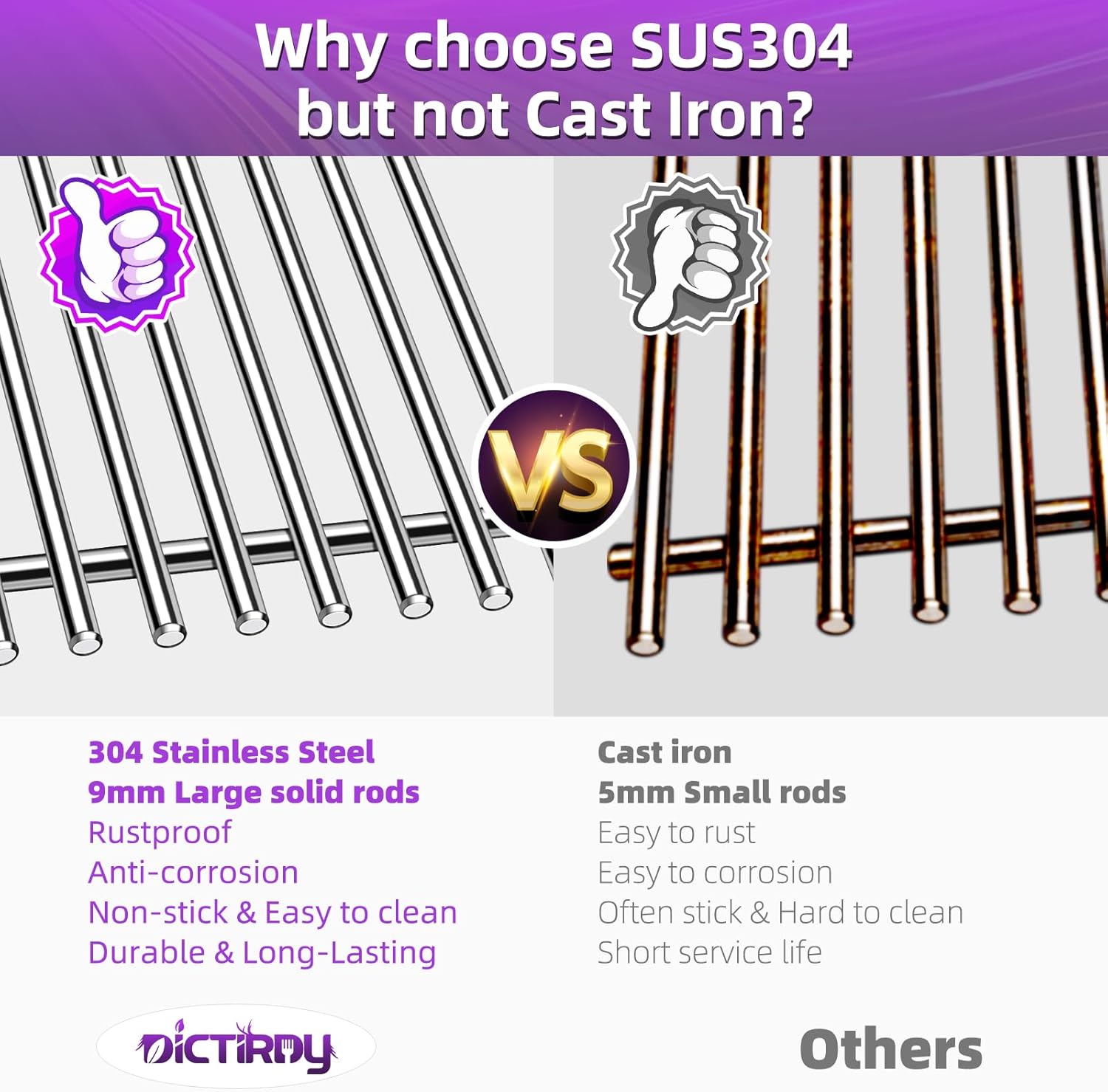 - 【9MM Diameter Solid Rods】Thickness of Dictirdy cooking grate is 9MM, more thicker and stronger than other 5mm/ 7mm grill grates. Our barbecue cooking grill grates feature SUS304 thicken solid rod bars, which are not easy to deform and more durable for long time using.