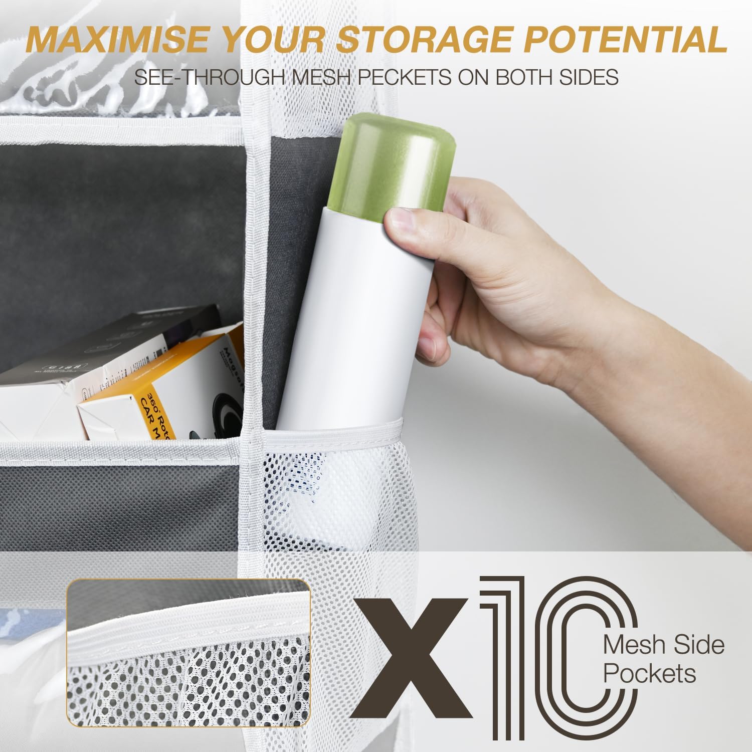 - 【Smart Mesh & Clear View System】: The Hanging storage organizer with 10 ventilated mesh pockets (side + front) securely organize small items (diaper, towel,toys, clothes, keys, cosmetics, chargers). PVC windows enable instant content checks without unloading, perfect for high-traffic areas like bathrooms or entryways and it can also track spice expiration dates, while deep sides mesh pockets hold recipe cards or measuring spoons.