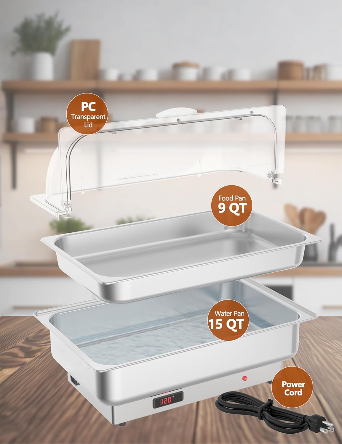- 【Food Grade Stainless Steel & Roll PC Lid】Warming trays for buffets party is made of food grade stainless steel with a 1/1 NSF-certified food pan. PC lid is made of PC material.