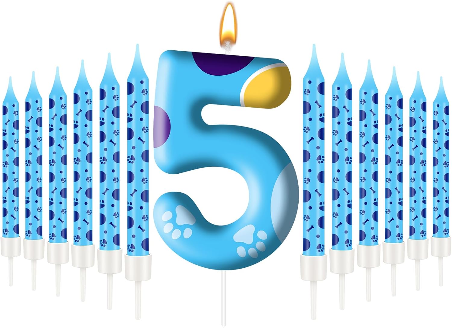 13PCS Blue Dog Paw Birthday Candles Set Cake Topper Numeral Birthday Candles for Boy Girl Dog Paw Decoration(Number 5)