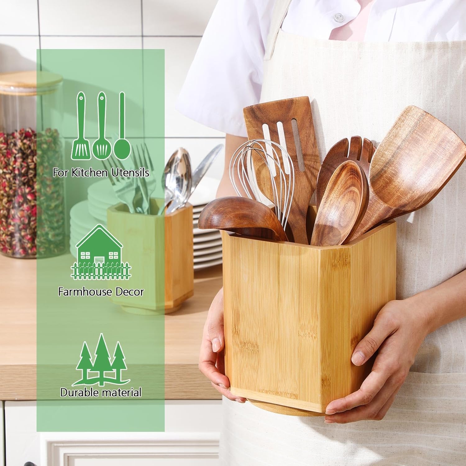 2 Pack Wooden Utensil Holder, 360°Rotating Kitchen Cooking Utensil Crock, Spoon Spatula Holder for Kitchen Counter, Farmhouse Countertop Organizer ()
