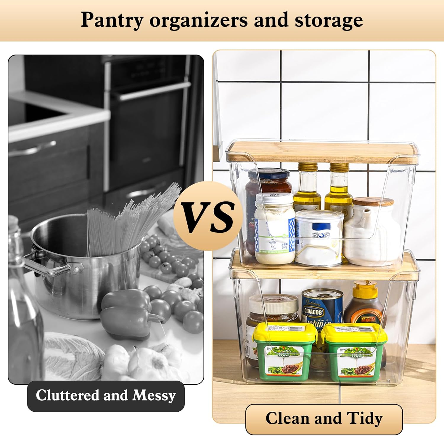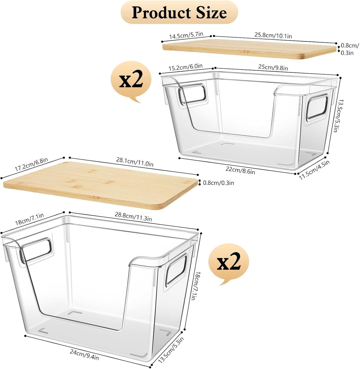 4 Set Stackable Storage with Removable Bamboo Cover, Plastic Container for Kitchen Organizers, Clear Front Open More Easy Access Bins Storage for Pantry, Potato, Onion, Garlic, Fruits, Vegetable