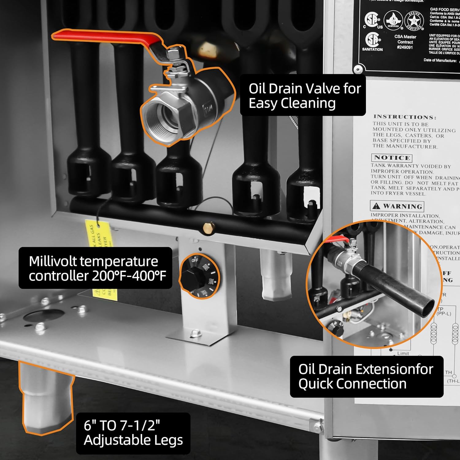 - Industrial-Grade Durability Meets Smart Design: Constructed with 430 stainless steel, CSA design certified, NSF listed the fryerβs seamless interior and reinforced weld points resist grease buildup and corrosion. The 5-tube burner system distributes heat evenly across the cooking surface. Integrated flame failure protection and automatic 450Β°F shutoff exceed commercial kitchen safety standards