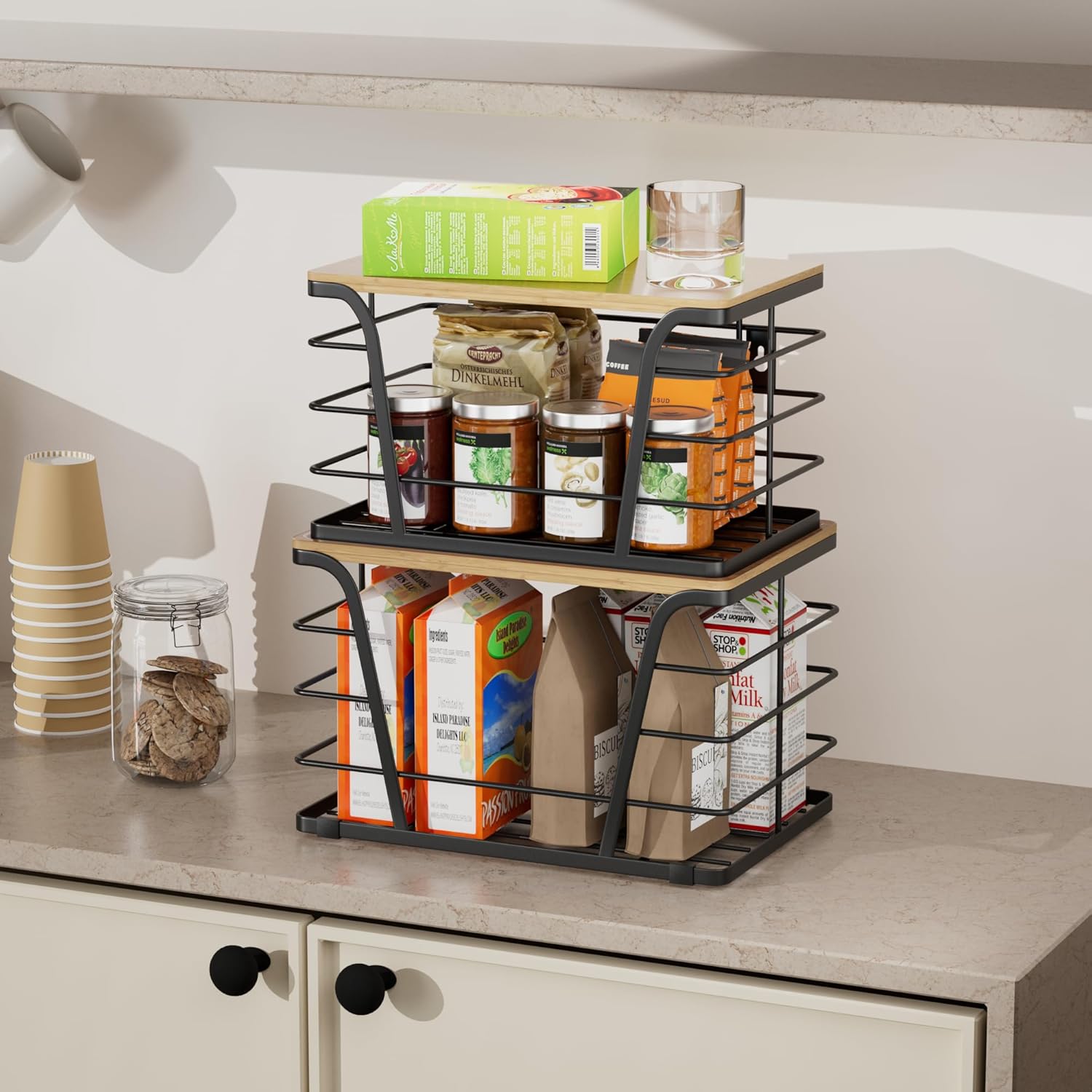 2 Pack Extra Large Pantry Storage Organizers, Pantry Baskets organization, Potato and Onion Storage Bin, Wall Mount Trash Bag Storage for 13-33 Gallon Bags with Bamboo Top, Black