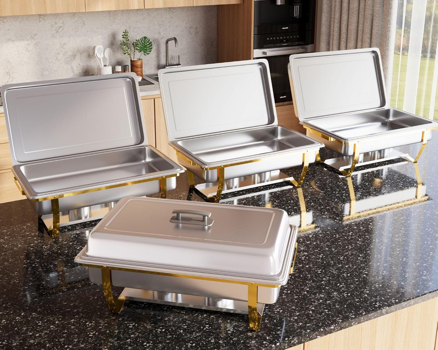 4 Pack 8QT Chafing Dish Full Set – Stainless Steel Catering Chafer with Lids, Pans & Fuel Holders – Buffet Food Warmers for Parties, Events & Weddings – Gold Frame