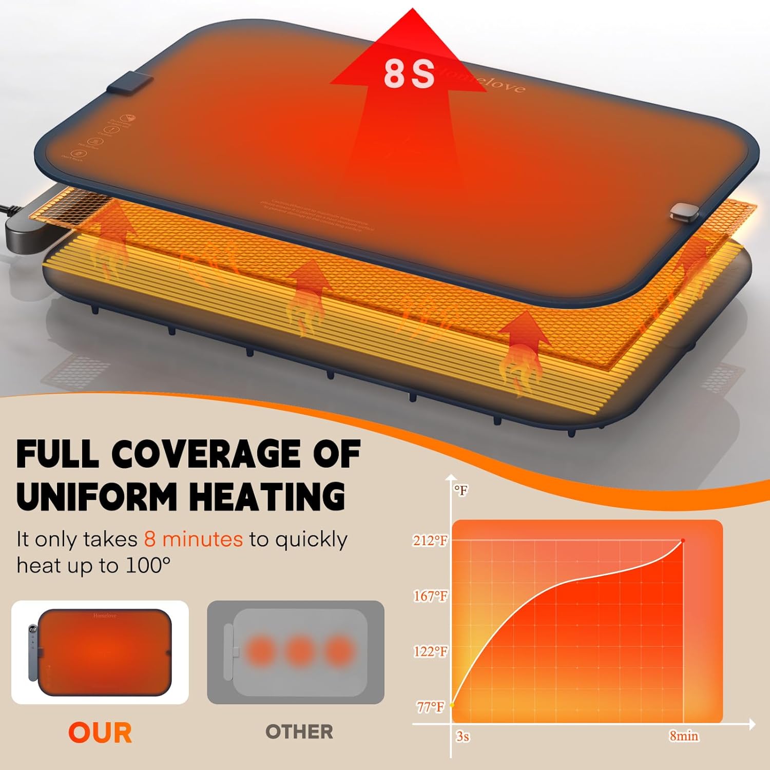 - 6 Level Temperature & 6 Timer Settings: To maintain the taste of food, The heating mat featuring a 1-6 hour timer and 6 levels of temperature control (122°F - 140°F - 158°F - 176°F - 194°F - 212°F), this warming mat gives you full control, perfect for heating dishes, thawing steak, fermenting dough, and more.