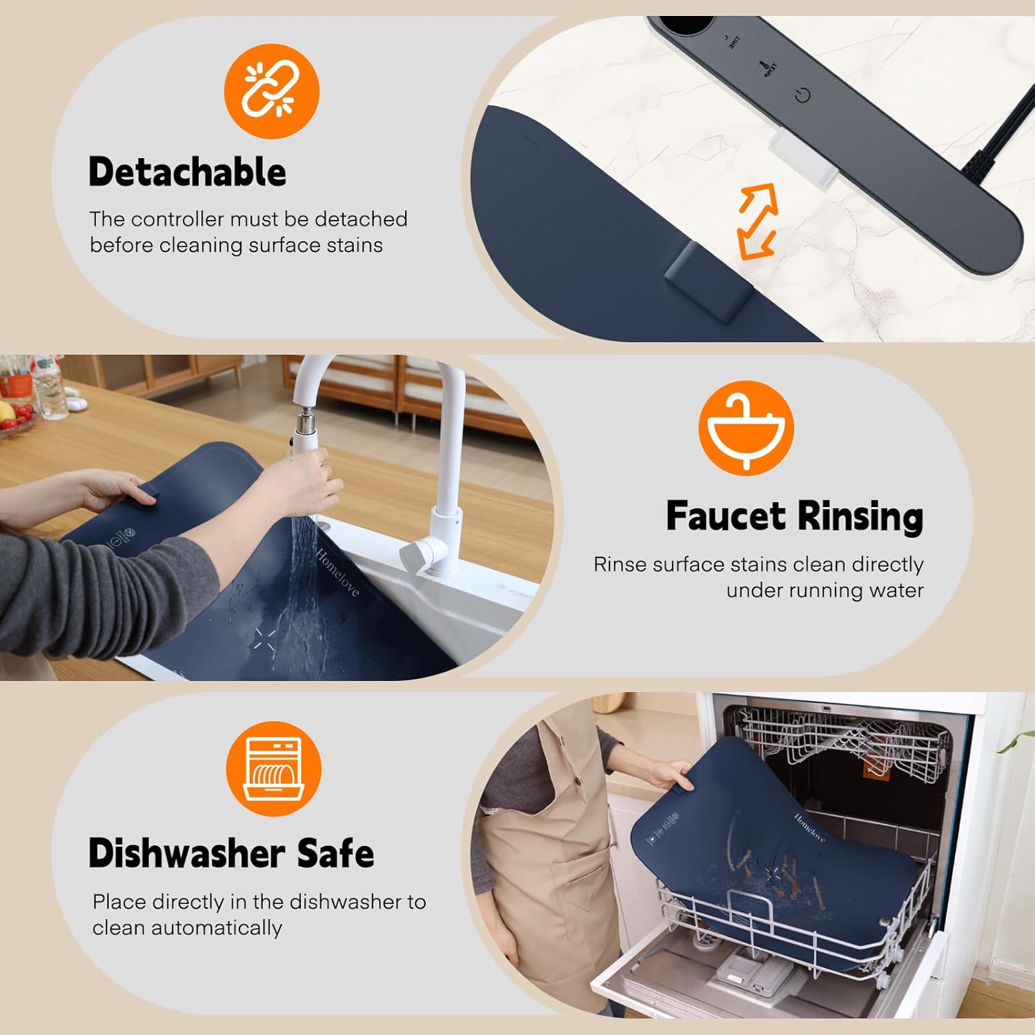- Washable and Dishwasher-friendly: The control board and heating board of our food warming mat are detachable. Simply remove the control board, and the heating board is waterproof and washable, you can put it in the dishwasher for cleaning, spend more time enjoying your meals and less time cleaning up.