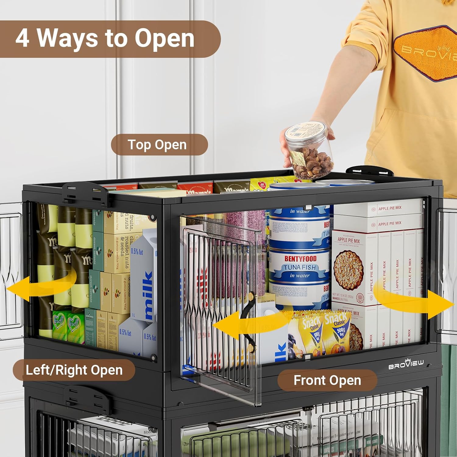 - 【Four Ways Opening and Magnetic Closure】The plastic storage bins with lids feature 4x opening methods - front double doors, right door, left door, or top lid opening. The front and side door with magnetic design are convenient for daily access, while the lids with latch is convenient for taking larger items such as quilts and blankets.