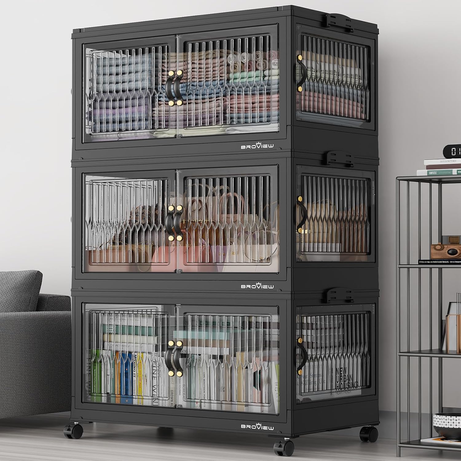 360QT Large Stackable Storage Bins with Lids, Plastic Closet Organizer and Storage Drawer, Collapsible Storage Box with Wheels, Folding Storage Cabinet with Doors for Home Kitchen, 3Pack Black