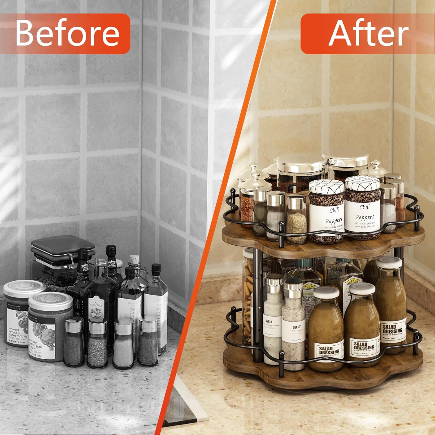 - 【Quality Materials】This 2-Tier Lazy Susan Organizer is made of vintage solid wood and metal and is very sturdy and durable. Unlike ordinary wood, it has a special coating that makes it waterproof and heat-resistant, so it can be used in a variety of scenarios and is much easier to clean.