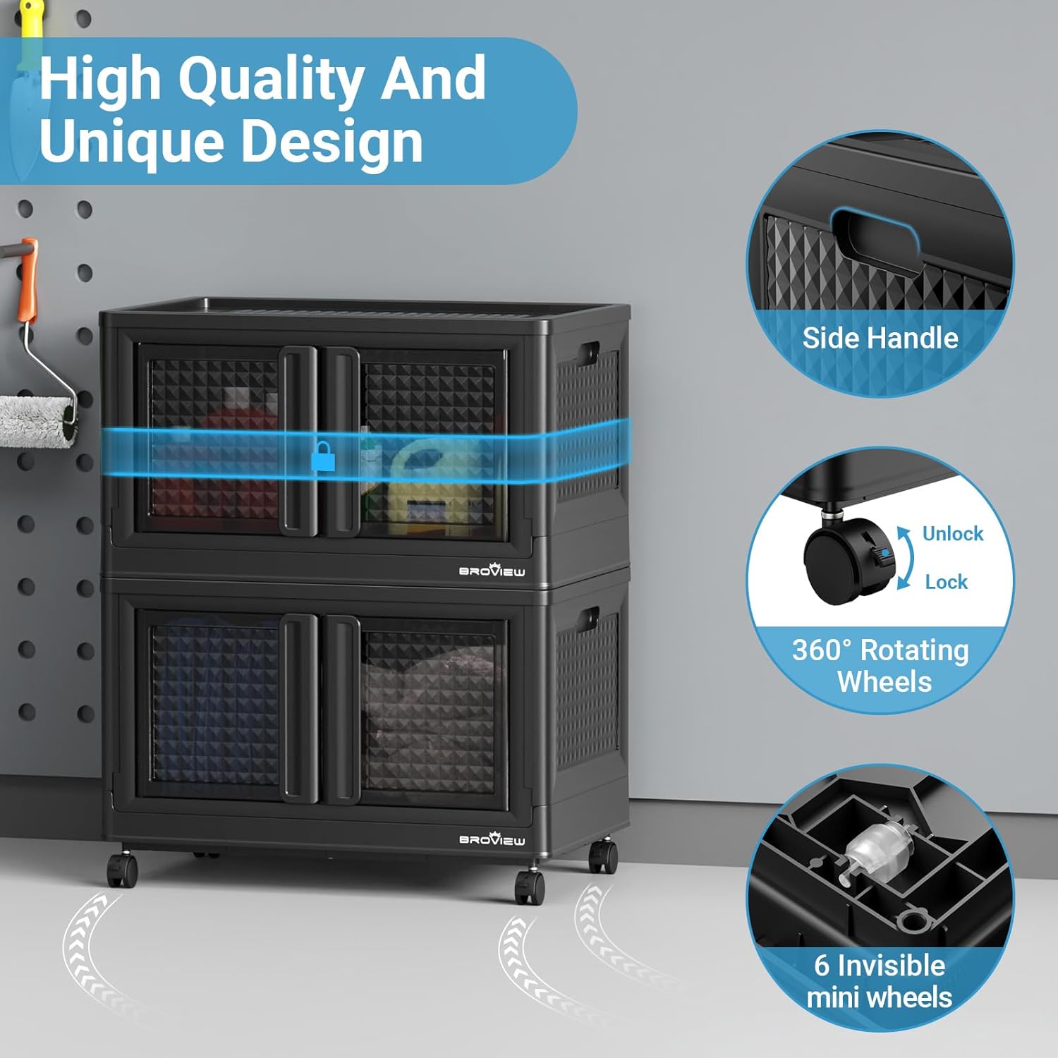 - 【Lockable Doors and 360° Rolling Wheels】The storage box offers two options: front-opening doors or top-opening doors. The door can be easily opened or locked by simply rotating 90°. The locking design effectively isolates pets such as dogs and cats from intrusion. The 4x 360-degree rotating wheels all have fixed functions and can be easily moved by releasing the valve, making them friendly to the elderly and young.