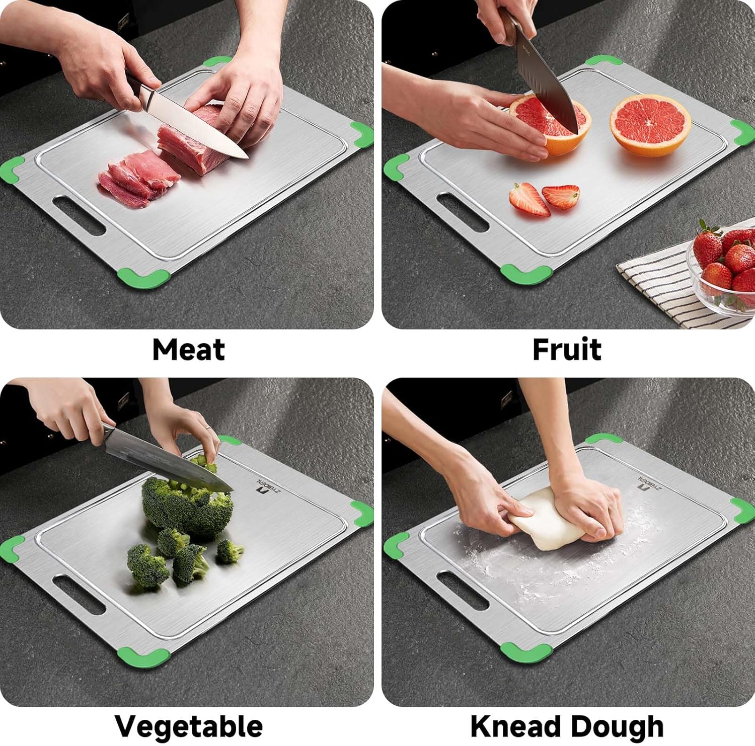 100% Pure Titanium Cutting Board with Grooves, Update Double Side Titanium Chopping Board, Silicone Anti-slip Stainless Cutting Boards for Kitchen 10 * 14 IN, Green