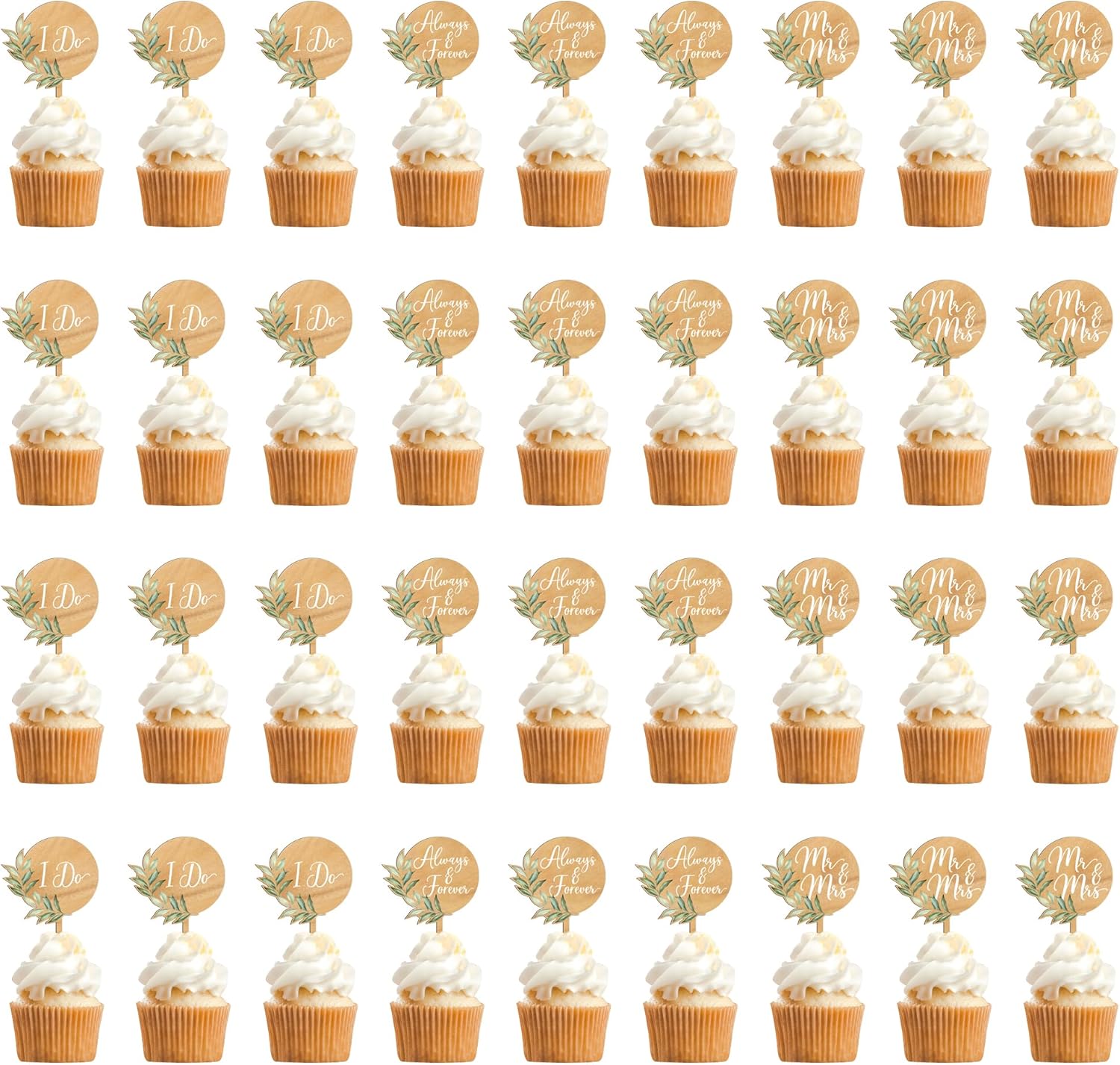 36 PCS Greeny Wedding Cupcake Toppers in Wood Mr & Mrs Engagement Cupcake Decorations