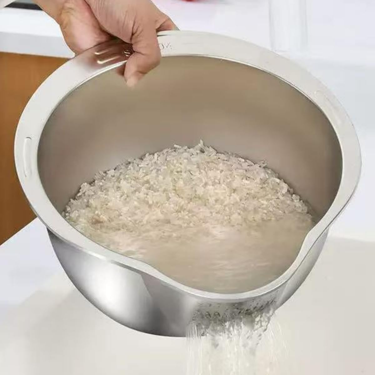 - Drain holes in drainer side let water flow out from basin, good for washing rice and fruits grains, vegetables, Also drain pastas and noodles in this bowl.