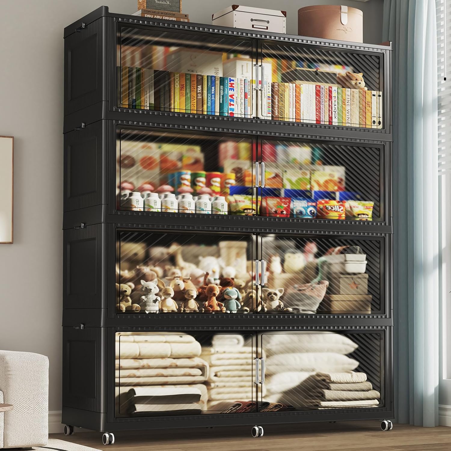- 【Foldable, Stackable, Quick Assembly】Our large plastic storage bins can be quickly unfolded or collapsed in just 3 minutes to maximize space utilization. It can be stacked layer by layer into a cabinet, with side buckles to secure each level in place, preventing tipping or scattering. An essential large storage cabinet for homes and dorms.