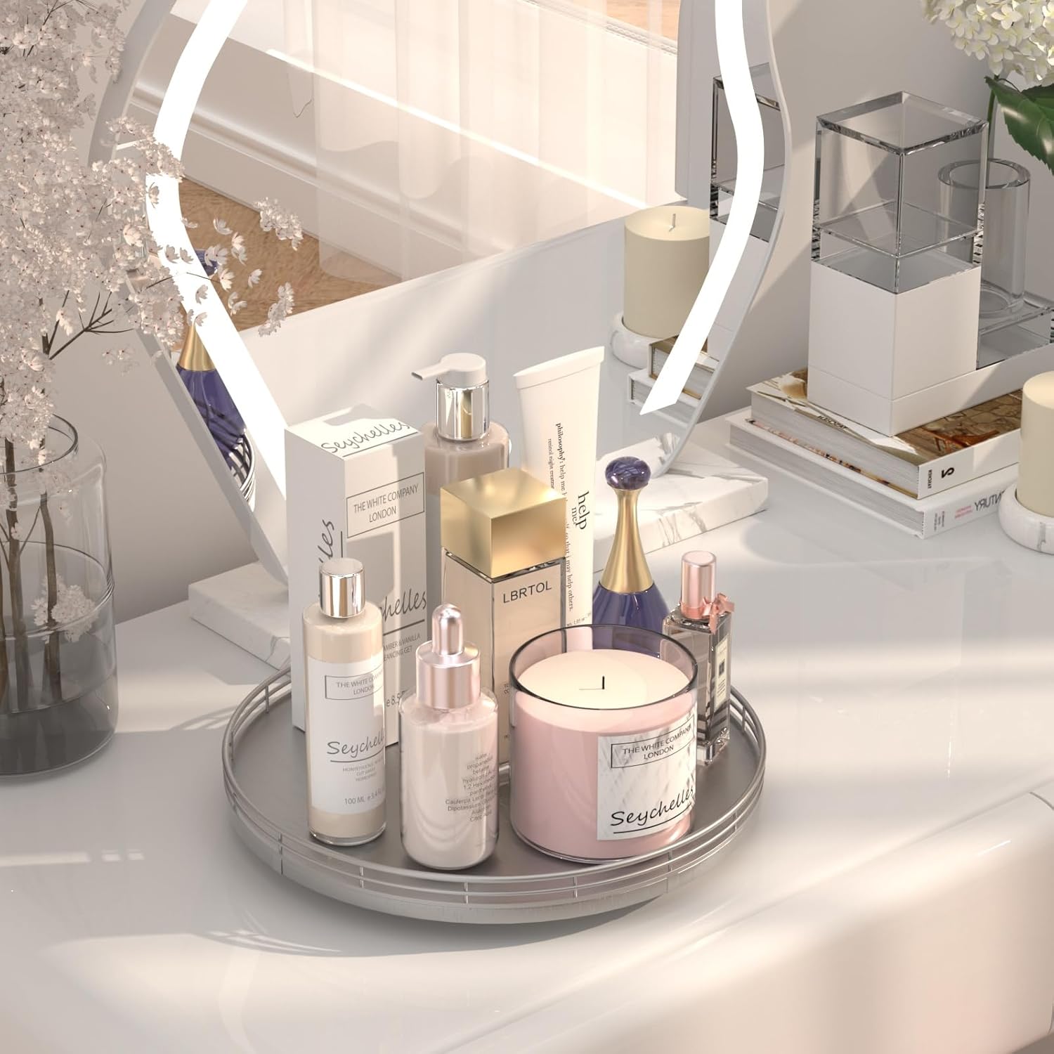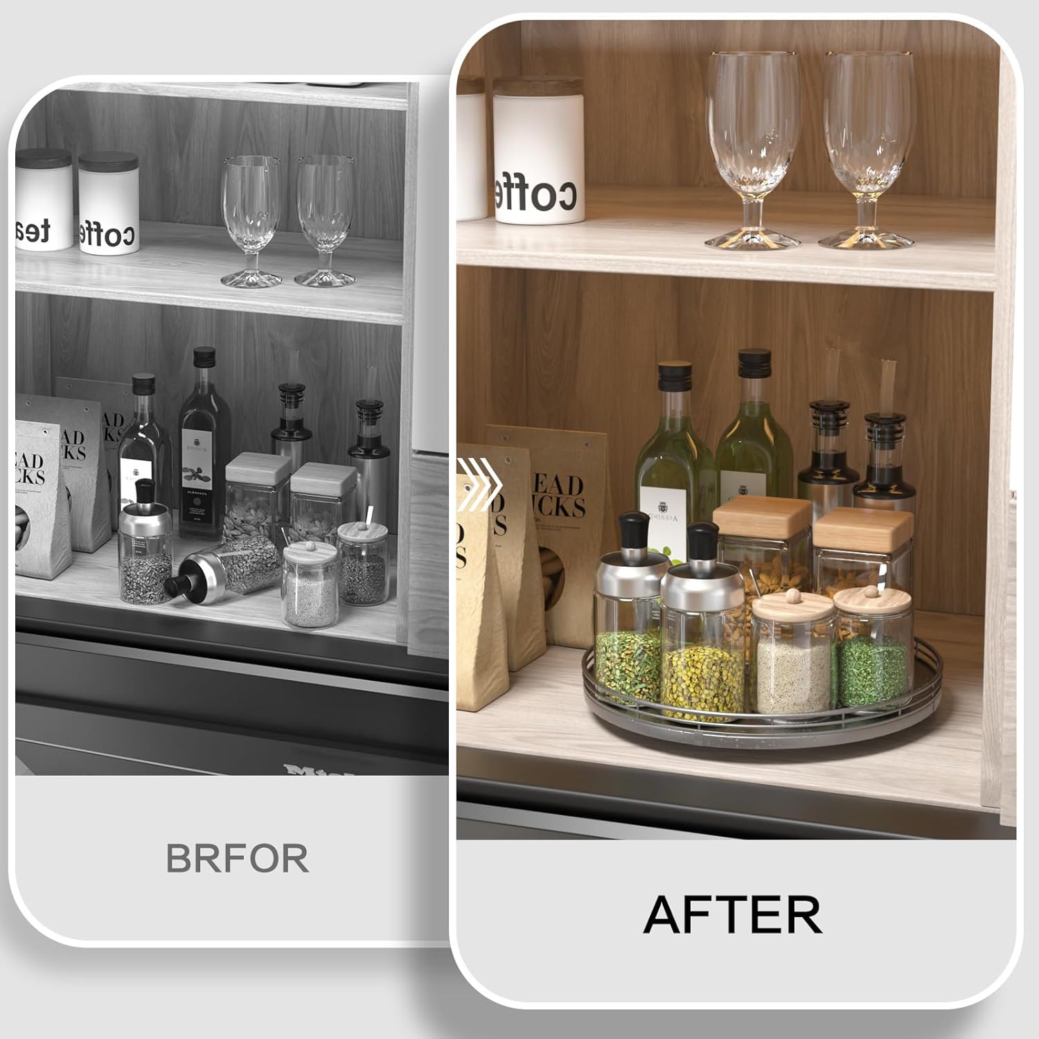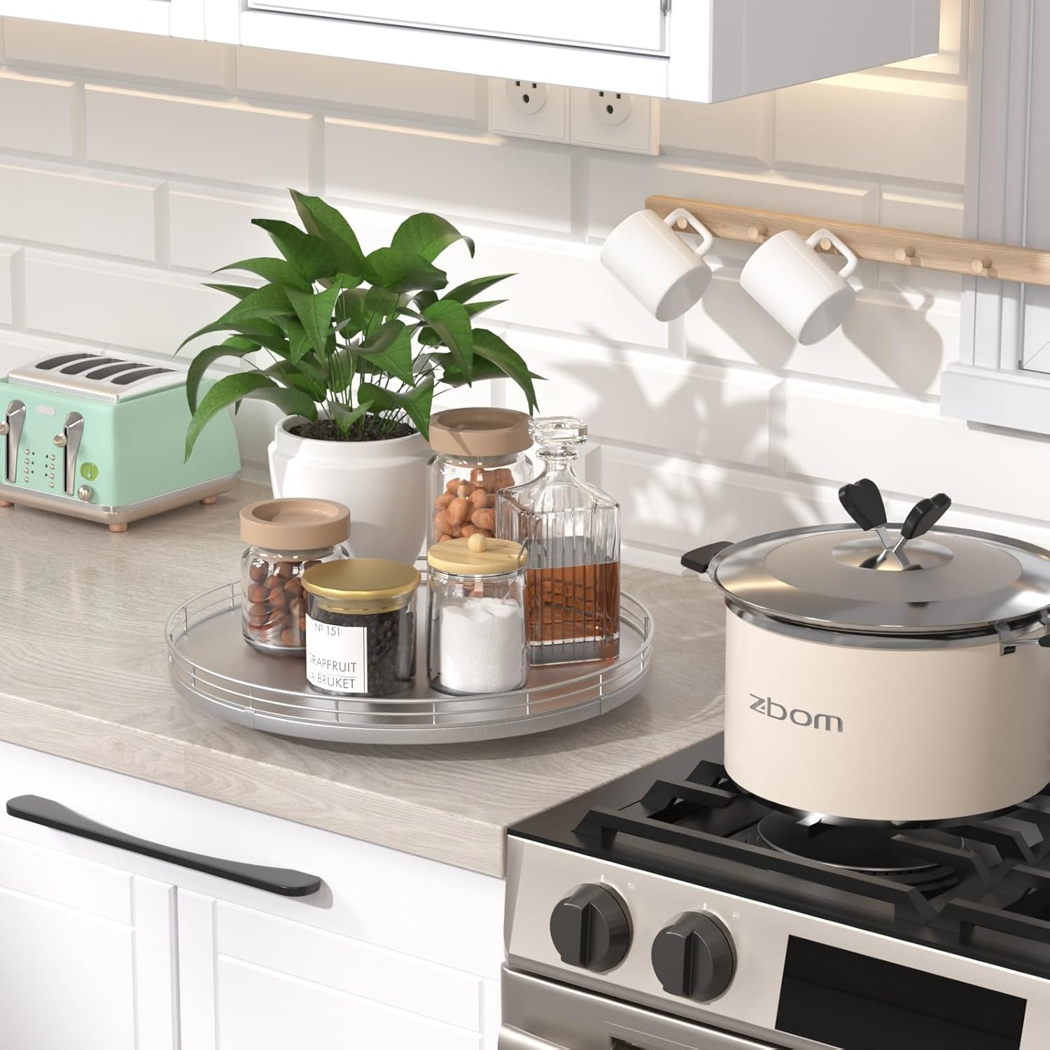 - Thoughtful Design: The turntable silver tray features a smooth and silent 360Β°rotation; Bottom slip-resistant pads for stability and protect your countertop from scratches; Raised edges on each organizer tray to keep items from falling out; Easy to use, no installation required