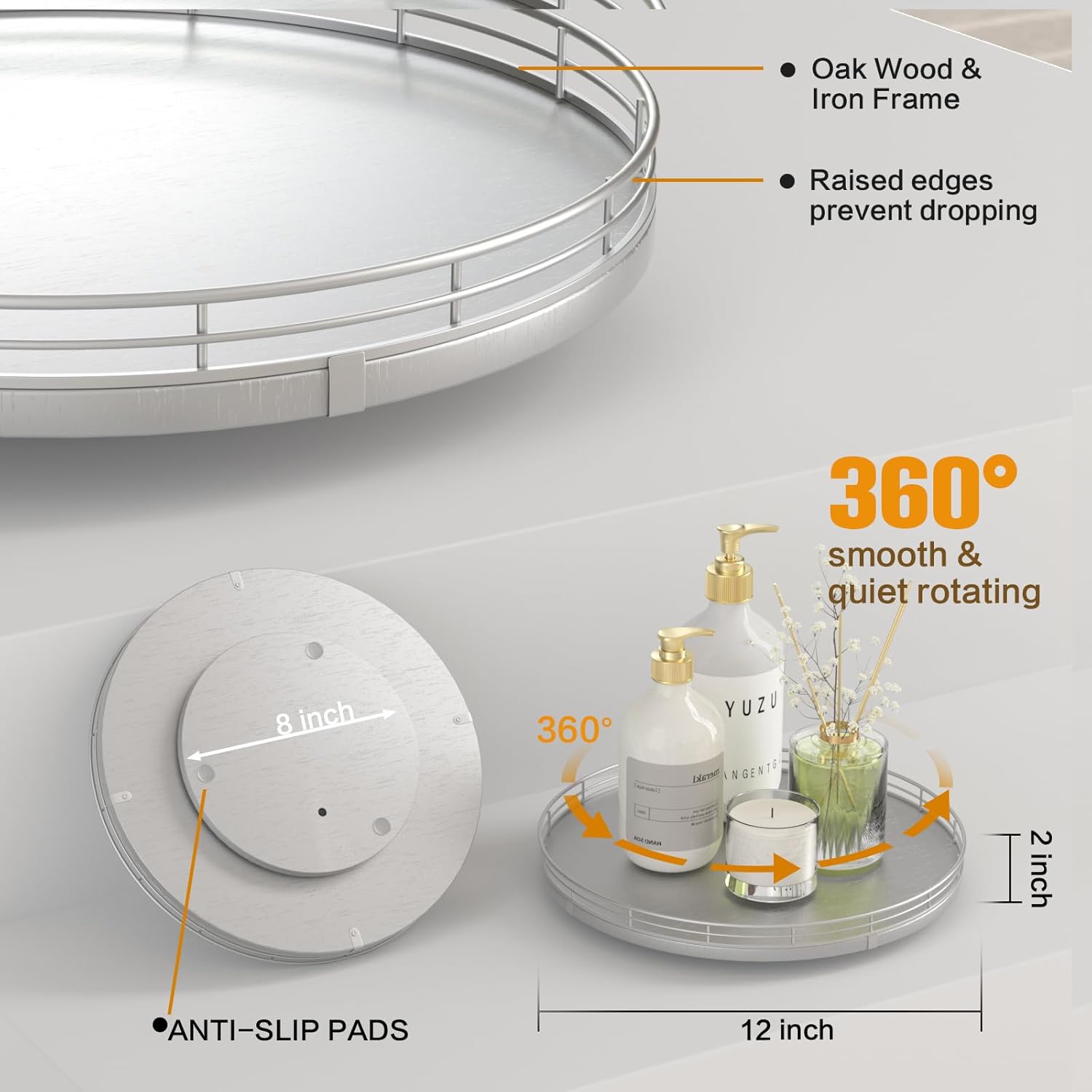 12" Silver Lazy Susan for Table Top, Oak Wood Lazy Susan Turntable Organizer for Dining Coffee Table Centerpiece Bar Decor Kitchen Countertop Bathroom Vanity Decorative Tray for Perfume Jewelry Round