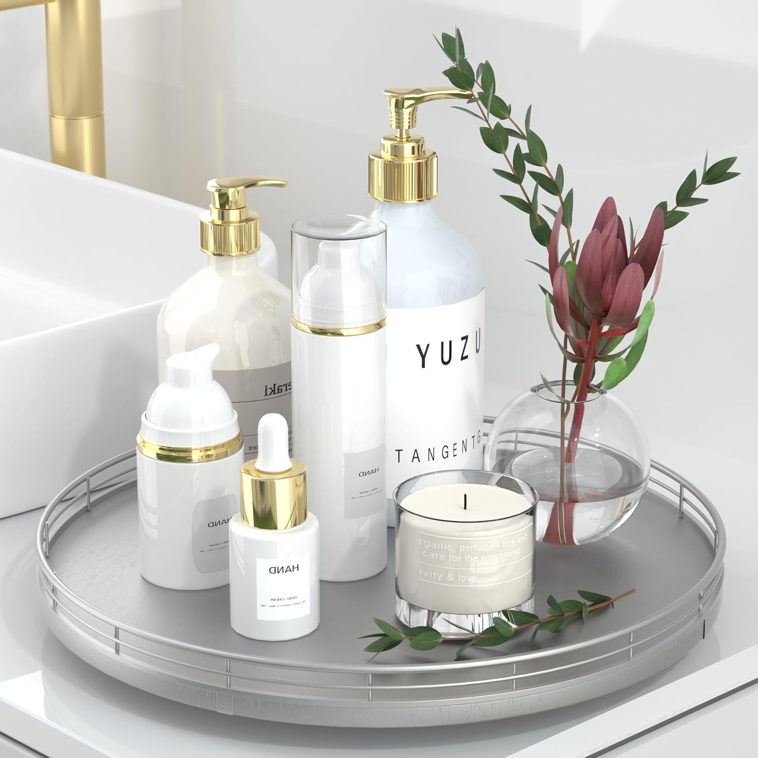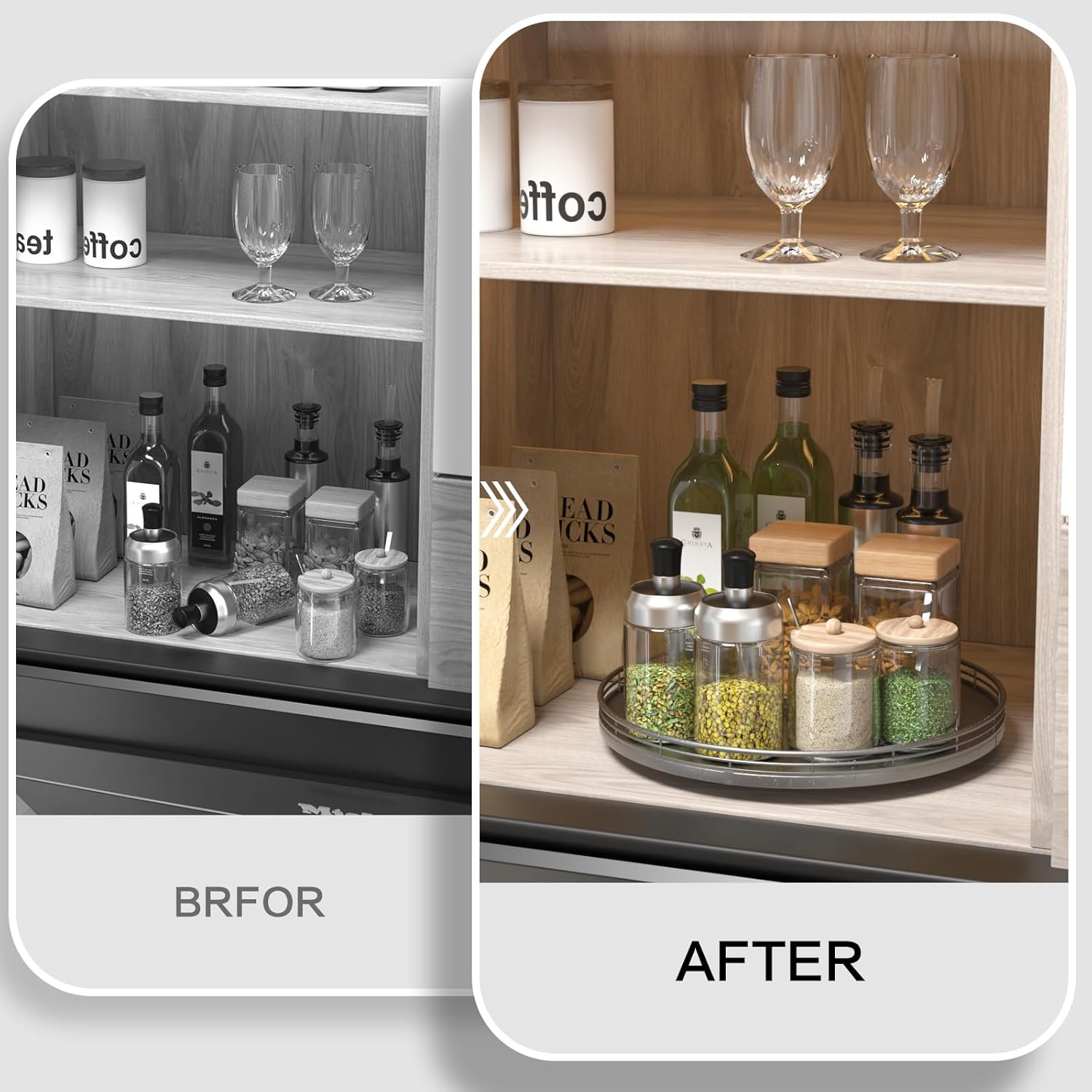 - Thoughtful Design: The turntable silver tray features a smooth and silent 360Β°rotation; Bottom slip-resistant pads for stability and protect your countertop from scratches; Raised edges on each organizer tray to keep items from falling out; Easy to use, no installation required