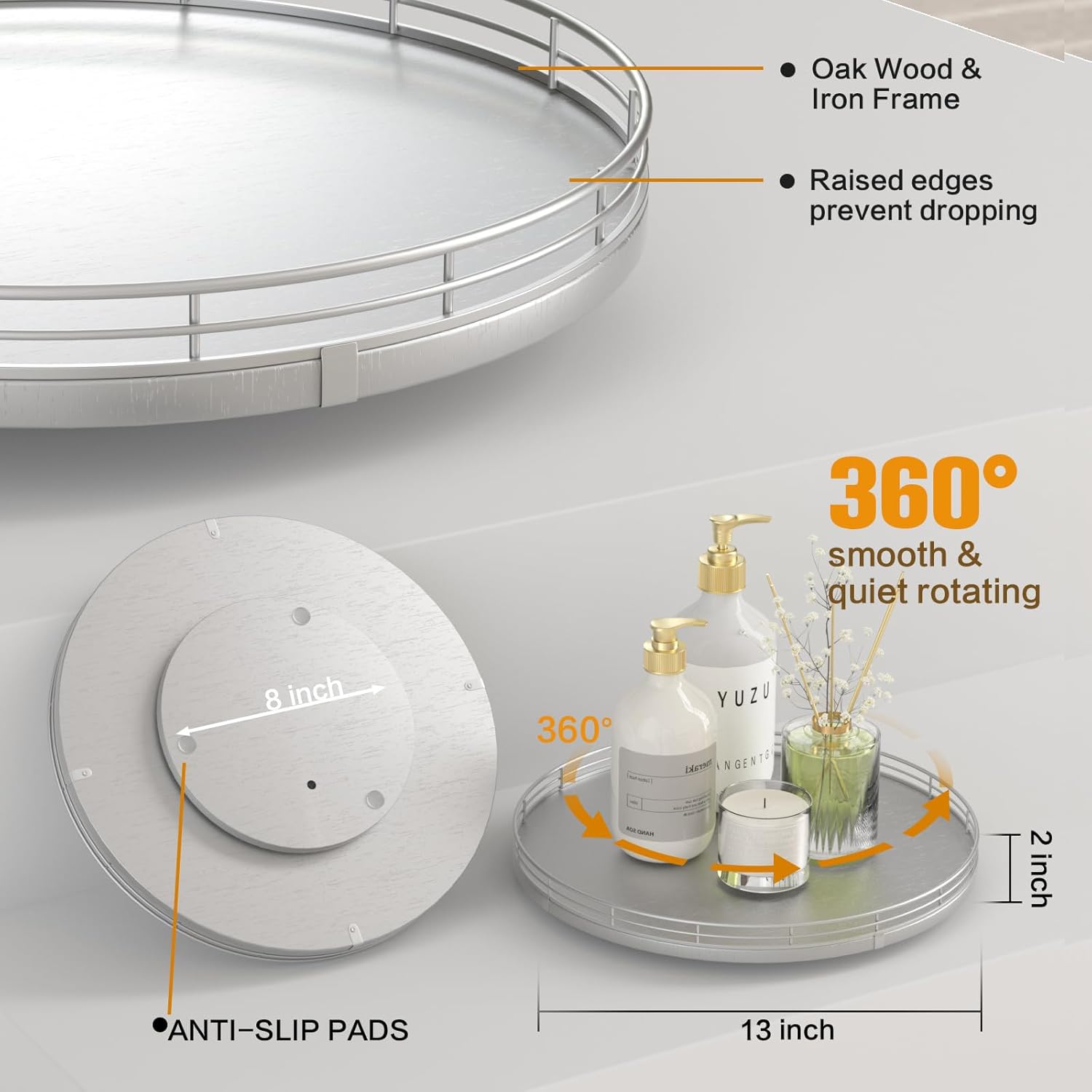13" Silver Lazy Susan for Table Top, Oak Wood Lazy Susan Turntable Organizer for Dining Coffee Table Centerpiece Bar Decor Kitchen Countertop Bathroom Vanity Decorative Tray for Perfume Jewelry Round