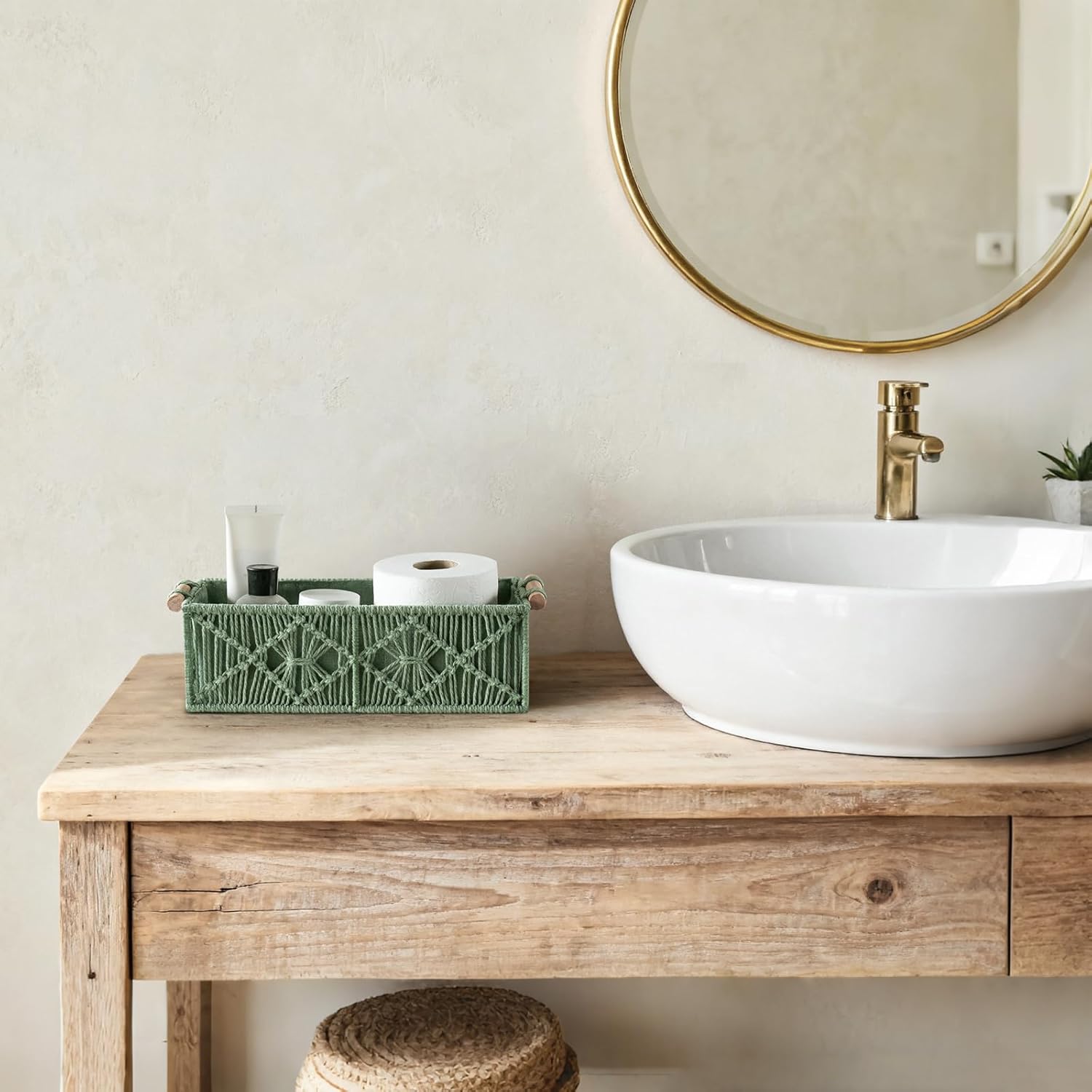 Mkono Macrame Storage Baskets Boho Decor Box Handmade Woven Decorative Countertop Toilet Tank Shelf Cabinet Organizer for Bedroom Livingroom Home, Set of 2, Green